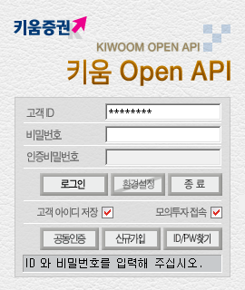 그럼 아래와 같이 Open API 로그인창이 나옵니다. KOA는 모의투자환경 접속 밖에 되질 않으니 모의투자 접속 체크버튼은 항상 활성화되어 있는 상태입니다.