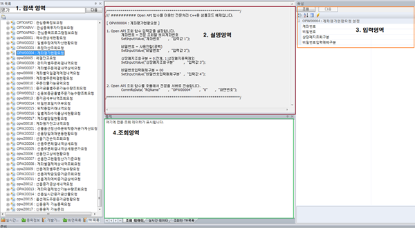 가운데 설명영역에 나오는 설명이 어떤 값들을 전달해야 OPW0004-계좌평가현황요청 거래를 할 수 있는지가 나옵니다.
