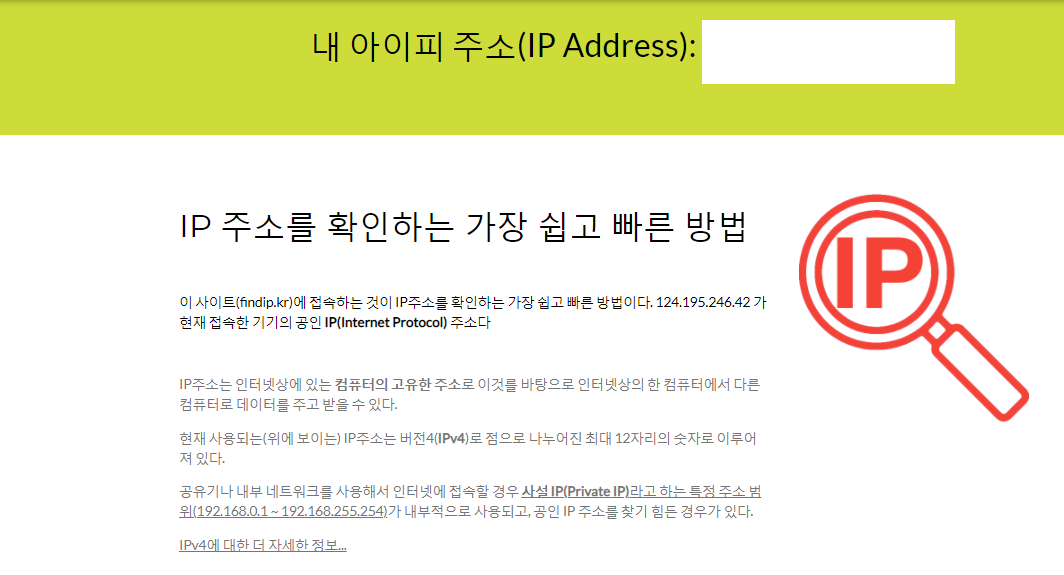 www.findip.kr/에 접속해 내 IP를 확인할 수 있습니다.