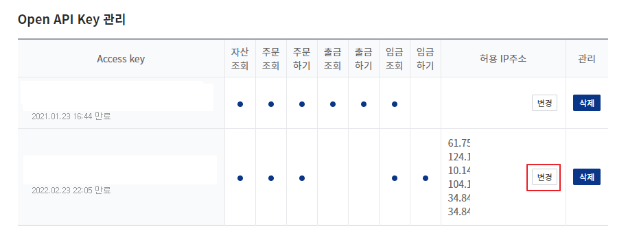 이미 발급받은 Key 정보에서 변경을 클릭합니다.