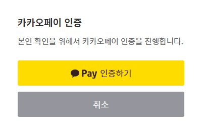 이후 카카오페이 인증 화면이 나옵니다. 인증하기 버튼을 누르면 자신의 휴대폰으로 인증 요청이 옵니다.