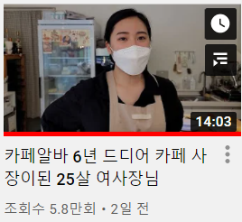 부모님과 떨어져 살면서 자기가 다니던 대학교 근처에서 창업한 카페 사장님(썸네일)의 이야기인데, 촬영하시는 분이 인터뷰하면서 이야기를 이끌어낸다.