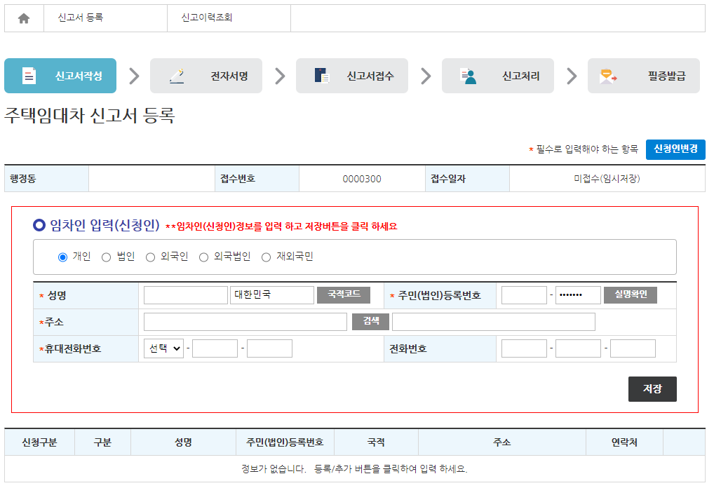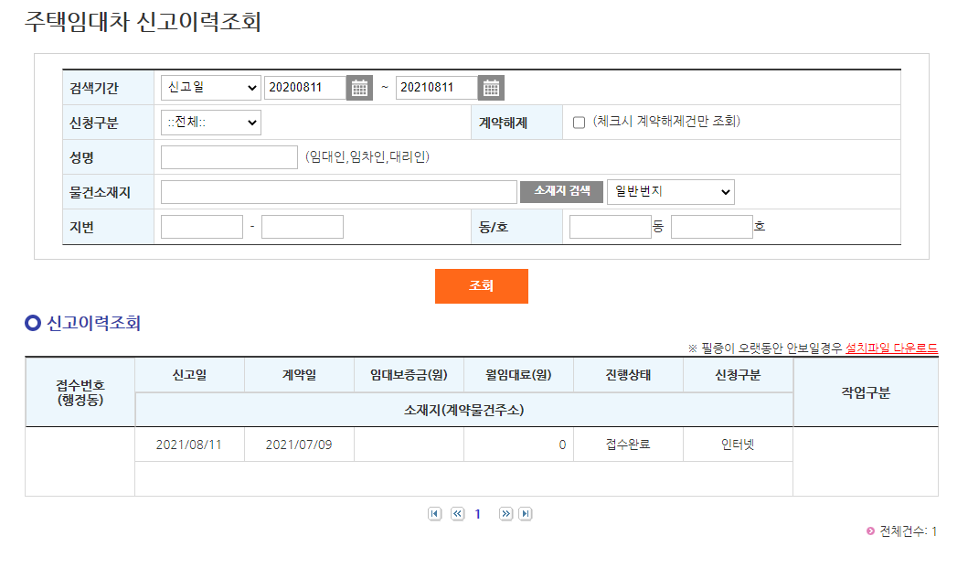계약서에 적힌 내용대로 임대인/임차인 모두의 정보 입력하고 나면 신고가 완료되고 이력 조회 페이지로 이동됩니다.