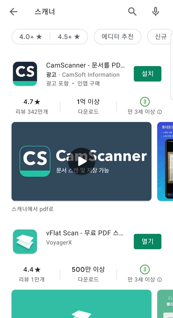 대표적인 스캐너앱은 CS(CamScanner), vFlat scan 등이 있으며 실행한 다음 계약서를 사진 촬영하듯 촬영하면