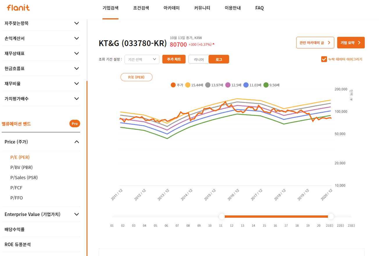 또 증권사 리포트에서 자주 보이는 벨류에이션 밴드도 선택해서 확인할 수 있습니다. 다음은 per 밴드를 이용해보았습니다. KT&G는 밴드 하단에 머물고 있네요.