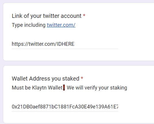 https://t.co/FgkmNAKL7l 구글폼으로 트위터 아이디와 스테이킹한 지갑 주소를 입력하면 됩니다!!