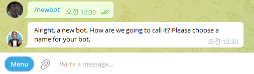 3)대화가 시작되고 대화창에 /newbot 을 입력합니다.