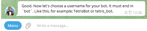 5)그 다음은 봇이름을 정합니다. 봇 이름은 끝날 때 bot으로 끝나야 합니다. (예. test_good_bot)