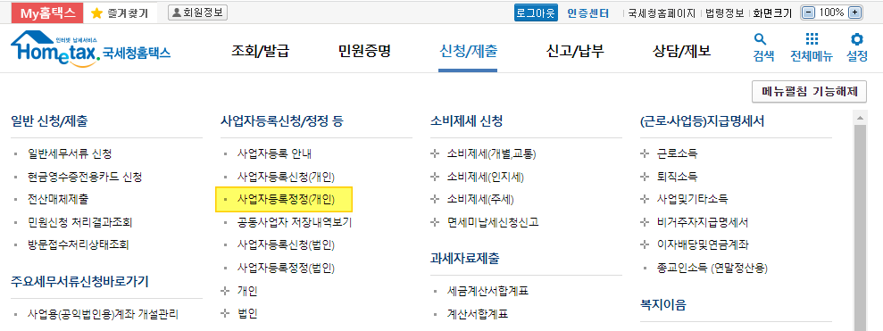 2.로그인 이후 신청/제출 > 사업자등록정정(개인)을 클릭합니다.