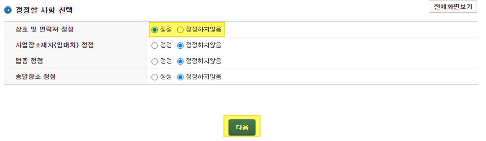 4.상호 및 연락처 정정을 클릭합니다. 이후 다음을 클릭합니다.