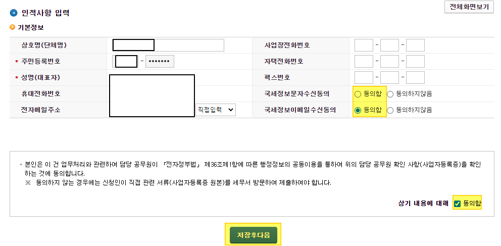 5.상호명 입력창에 입력 후 개인정보 동의버튼 클릭하고 저장후 다음 버튼을 누릅니다.
