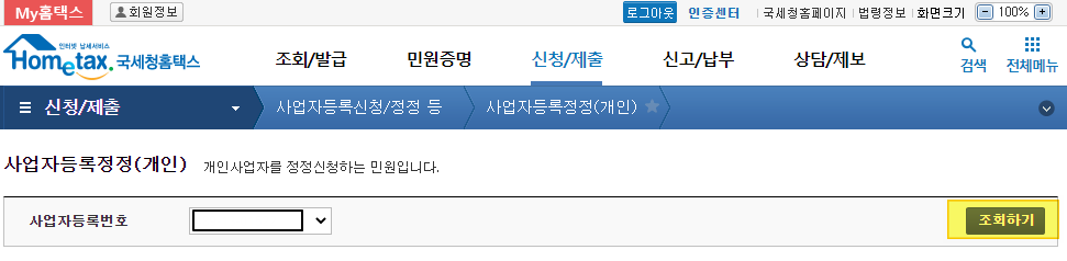 2.로그인 이후 신청/제출 > 사업자등록정정(개인)을 클릭합니다.