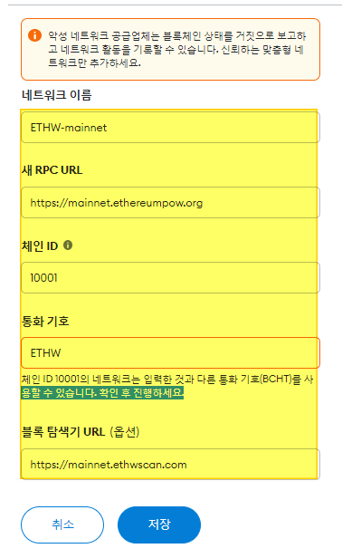 ETHW-mainnet 네트워크를 추가하면 됩니다.