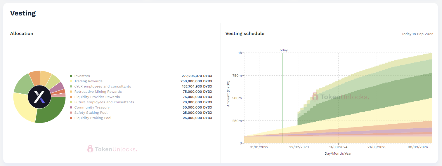 누구에게 할당되어 있는지(투자자, 보상, 자문, 마케팅, 트레져리) 그리고 언제부터 얼마나 물량이 풀리는지 차트로 잘 나오네요. 풀릴량이 너무나도 많은 dydx는 2023/02/22일부터 본격적으로 풀리기 시작하네요