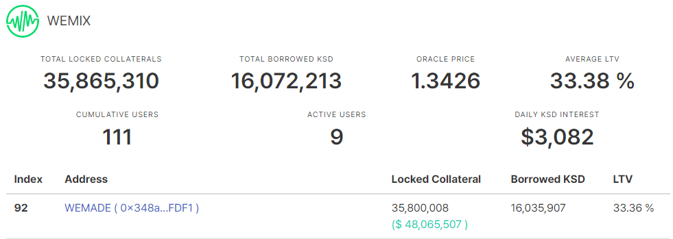 약 3천5백만개를 맡기고 천6백만달러를 빌려서 LTV가 33%가량인데 이 수치가 높아질수록 코코아파이낸스에서 위믹스를 청산해 위믹스 가격이 급락이 나올 수도 있는 위험한 상황입니다.