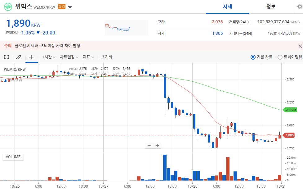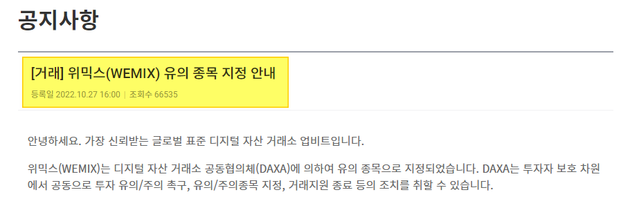 10/27 오후 위메이드의 위믹스 WEMIX 코인이 업비트 유의종목으로 지정되었습니다.