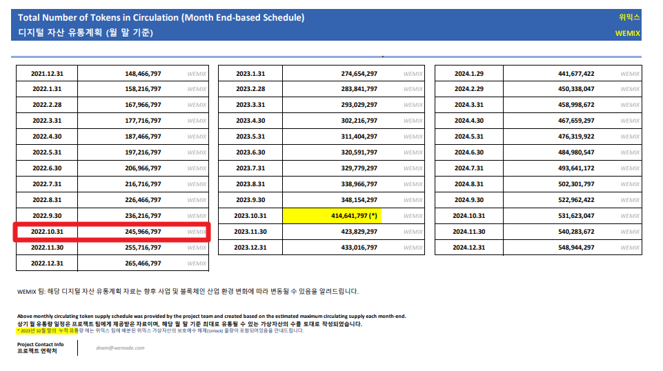 WEMIX의 유통계획은 22년 10월기준 2억4천만개인 반면