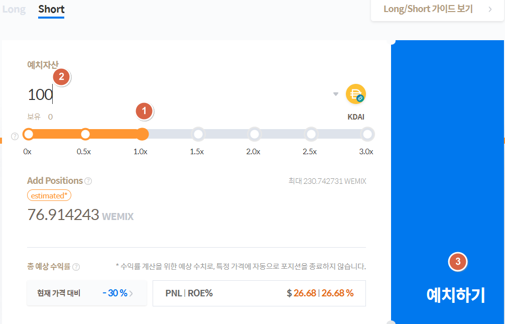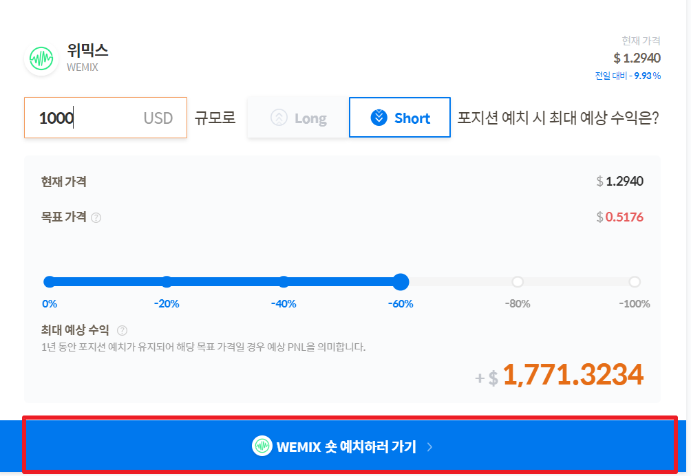 만약 이런 상황에서 위믹스의 하락을 점친다면 숏포지션을 잡을 수 있습니다.