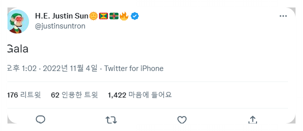 이후 후오비의 새주인이 된 저스틴 썬의 트윗하나로 후오비 GALA 코인 가격이 다시 떨어지기 시작했습니다.