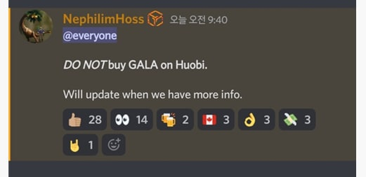 그런데 문제는 GALA 측에서 디스코드로 후오비 글로벌에서 절대 갈라코인을 사지말라고 공지까지 했었는데요.