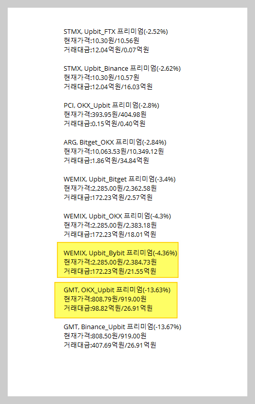 이런 식으로 6개의 국내/해외거래소끼리 상장된 코인의 가격을 실시간을 비교해알람을 보냅니다.