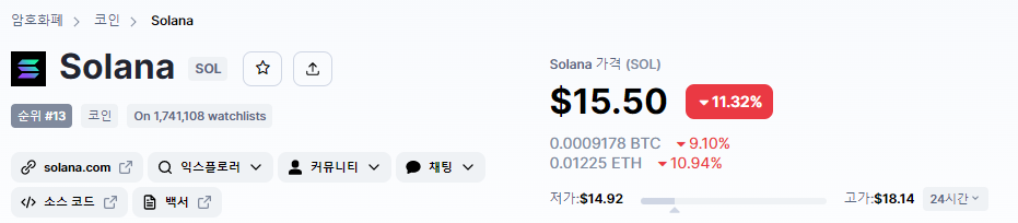 한때 시총 5위 안에 들던 솔라나가 13위까지 떨어졌는데, 그렇게 하락했어도 아직까지 시총 13위라는 것이 놀랍네요..