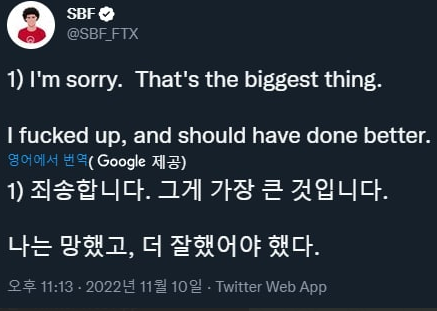 결국 FTX거래소, 알라메다리서치 창업자인 샘뱅크먼(SBF)이 공식적으로 FTX의 뱅크런을 인정했습니다.