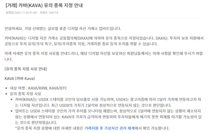 DAXA에서 루나사태를 많이 의식했는지 KAVA를 바로 유의종목으로 지정해버린 것은 투자자 보호차원에서 좋은 조치라고 봅니다.
