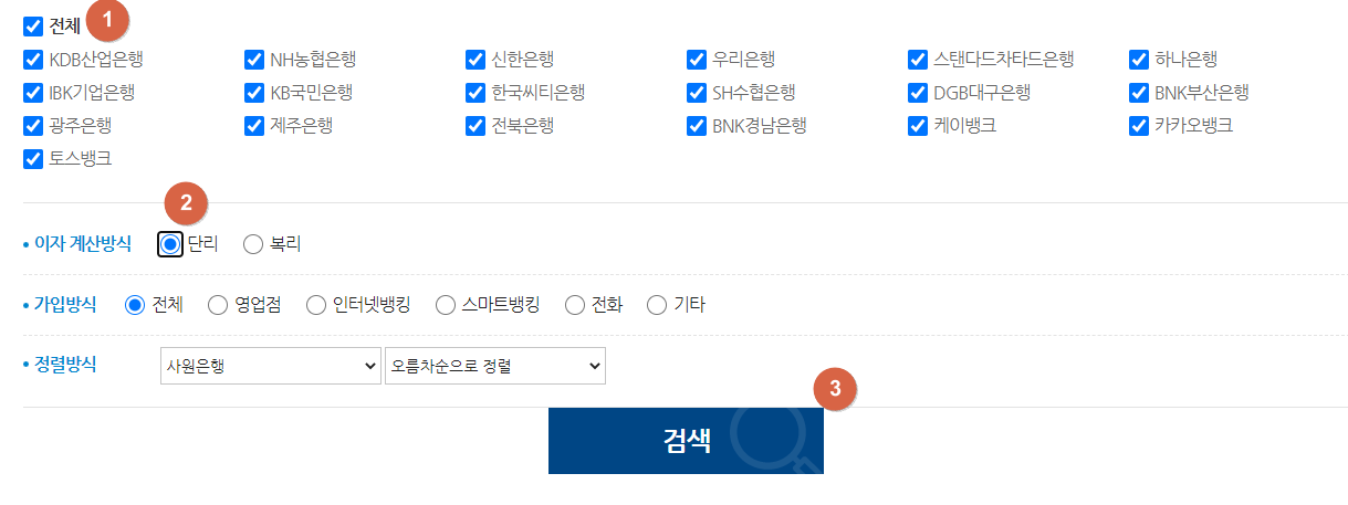 위 경로로 접속해서 은행별로 조건을 걸고 이자 계산방식(단리, 복리) 선택한다음 조회하면 됩니다.