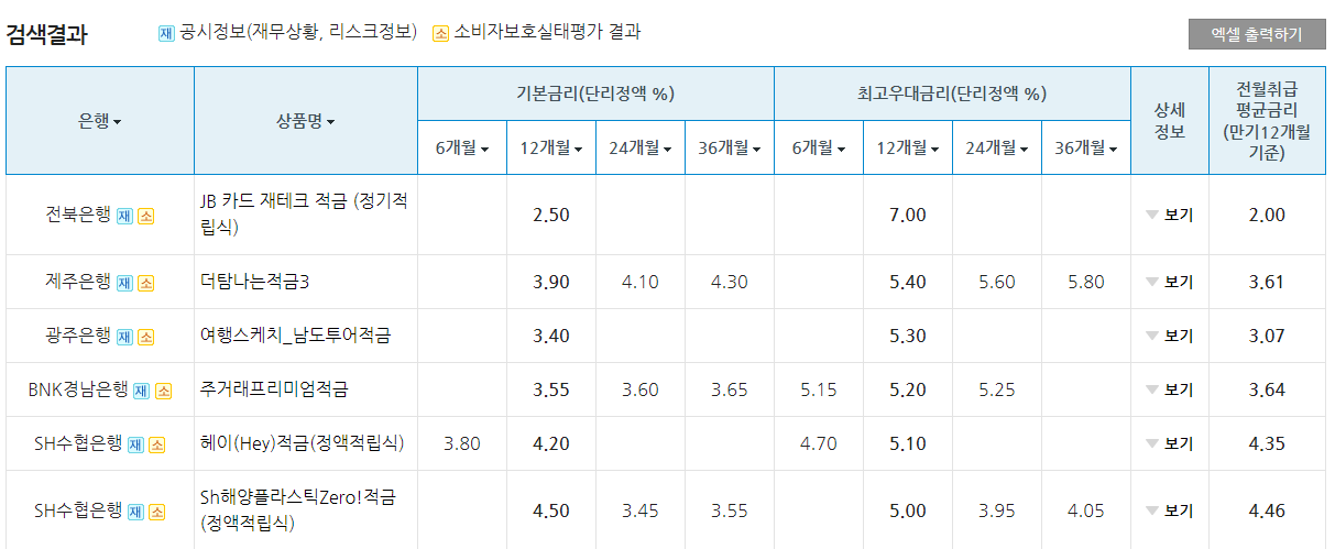전북은행이 7% 다음 제주은행이 5.4%입니다. 기본금리랑 차이가 많이 나는데요 적금가입할 때도 받을 수 있는 혜택과 최고우대금리를 적용받을 조건이 생각보다 쉬울 수 있기 때문에 잘 찾아보시기 바랍니다!