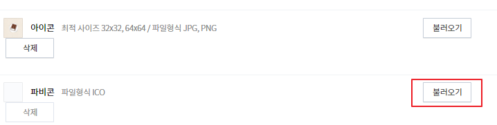 이후 나오는 탭에서 파비콘 > 불러오기를 클릭해주세요
