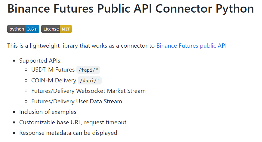 우리가 설치한 패키지는 binance 선물거래 API 사용을 간편하게 도와줄 도구라고 생각하시면 되며 앞으로 다룰 내용들은 아래 링크에 존재하는 샘플 코드들을 기반으로 합니다.
