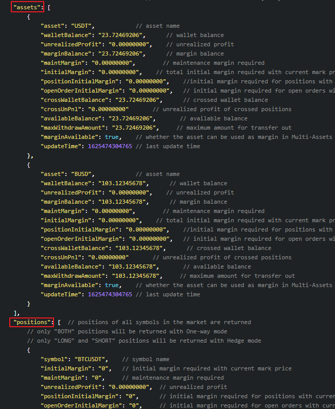 헷갈리기 쉬운 점은 USDT를 이용해 BTC롱 포지션을 취하더라도 실제로 BTC를 보유하고 있는 것이 아니기 때문에 이 경우 BTC를 자산으로 볼 수 없습니다. 증거금으로 사용하는 USDT, BUSD이 자산으로 구분되고 이를 이용해 BTC, ETH 롱/숏 계약을 체결했다면 이는 진입 포지션으로 구분할 수 있습니다. 실제로 API를 호출하더라도 잔고와 포지션에 대해 구분된 응답을 수신합니다.