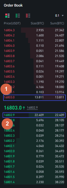 이에 대해 간단히 설명하면, 위 호가창에서 현재 체결가격이 16803.0 USDT이고 현재가 바로 위에 매도호가영역 중 16803.0이 최고매도호가(현재 제일 높은 매도호가, best ask price)이며 현재가 아래 영역 중 16802.9이 최고매수호가(현재 제일 높은 매수호가, best bid price)를 의미합니다.
