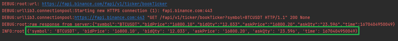 {'symbol': 'BTCUSDT', 'bidPrice': '16800.10', 'bidQty': '12.033', 'askPrice': '16800.20', 'askQty': '23.596', 'time': 1670404950049}