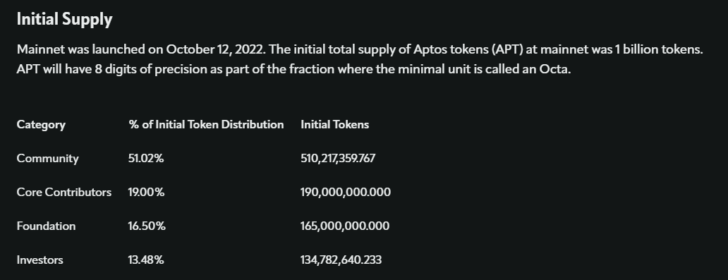 절반 이상을 커뮤니티 물량이지만 Aptos Foundation(앱토스 재단)에서 41.02% Aptos Labs가 10%를 보유하고 있습니다.