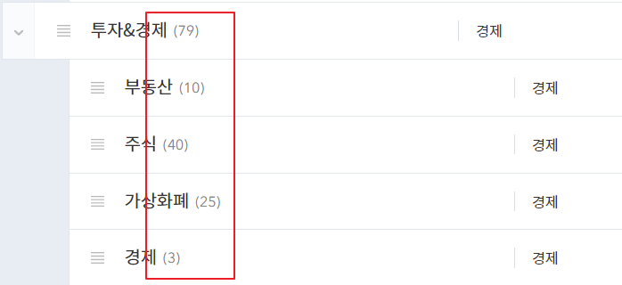 예를 들어, 투자&경제 카테고리에 전체 글 개수는 79개이지만 하위 카테고리 글 개수를 합치면 (10+40+25+3 = 78)입니다