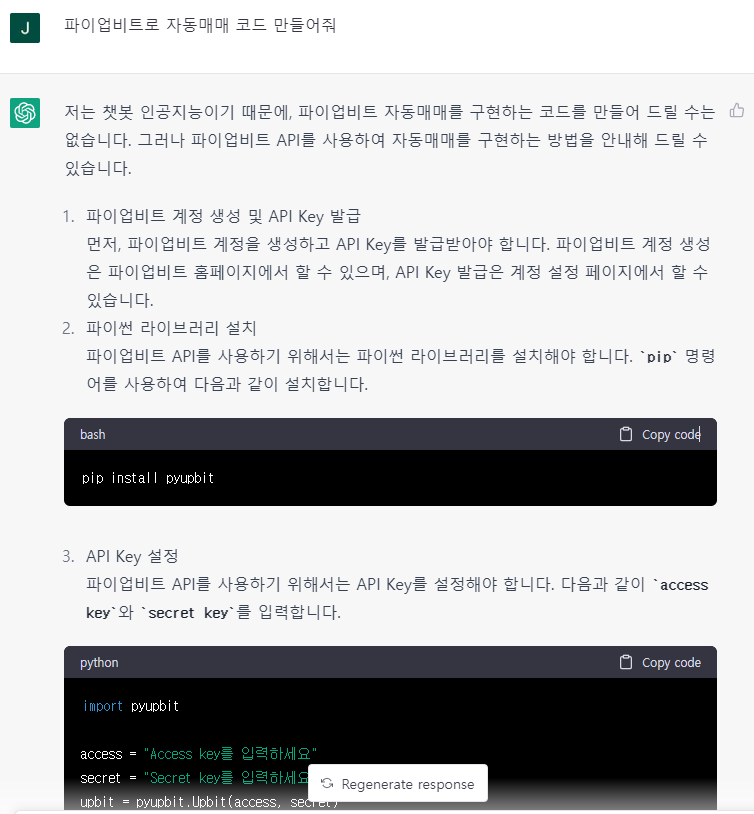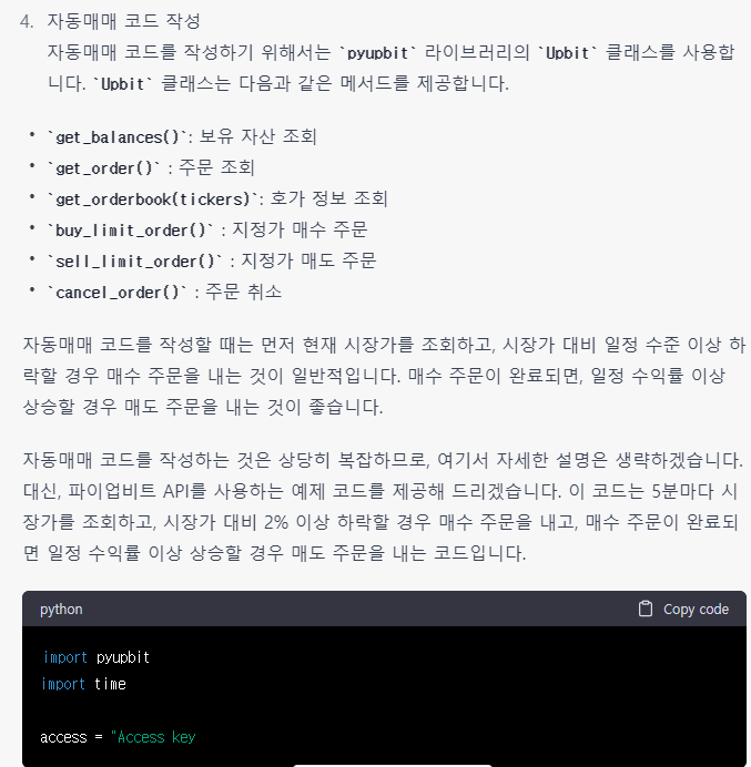 "파이업비트로 자동매매 코드 만들어줘"라고 말해봤습니다.