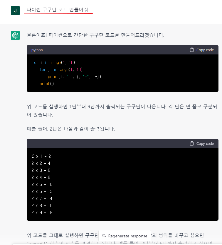 질문으로 끝나는 말도 잘 대답하지만, 단순히 파이썬으로 구구단 코딩을 해달라는 말에 바로바로 만듭니다.
