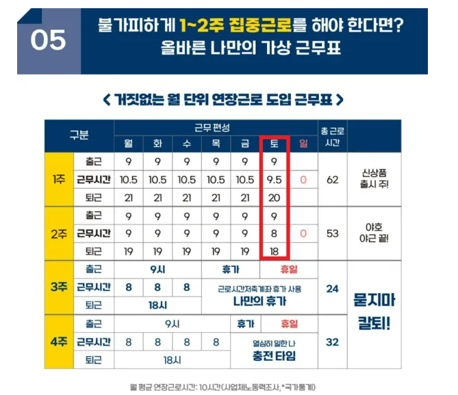 근무를 오래하게 되는 시즌이 되면(위 사진상 1,2주차) 나머지 3,4주차에는 근무한만큼 시간을 차감해 유연근무 혹은 휴가를 갈 수 있도록 하자는 것입니다.