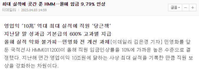 또 한동안 호황이었던 해운업계가 다시 내리막으로 올라가고 있는 상태에서 역대최대실적을 냈던 HMM은 매각을 염두한 듯 임금상승을 진행한 상태입니다.