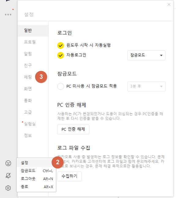 개인 작업 중 PC 카카오톡에서 사진, 동영상을 보내는 경우도 있습니다. 이런 경우에는 다음처럼 설정 버튼을 클릭합니다.