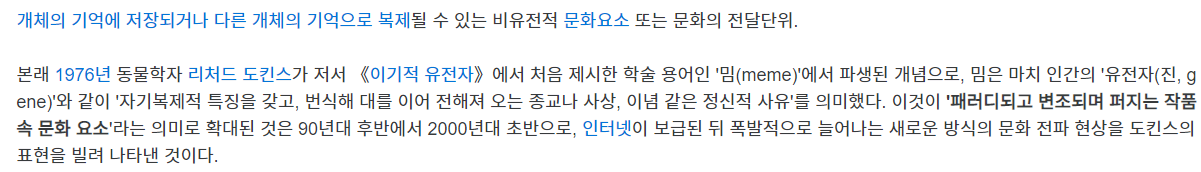 간단히 말해서 패러디나 문화요소 같은 것을 밈(MEME)이라고 부를 수 있겠습니다.