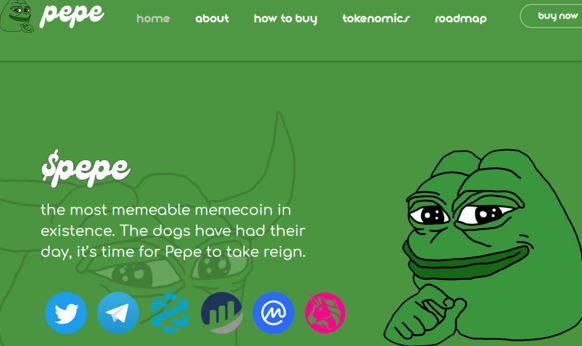 그러나 페페를 심볼로 삼았다는 것 말고는 현재로서는 사실상 아무 쓸모나 의미가 없는 코인이기 때문에 밈코인 그자체입니다. 페페코인의 공식 사이트에 들어가봐도 밈코인답게 장난스러운 분위기를 풍깁니다.