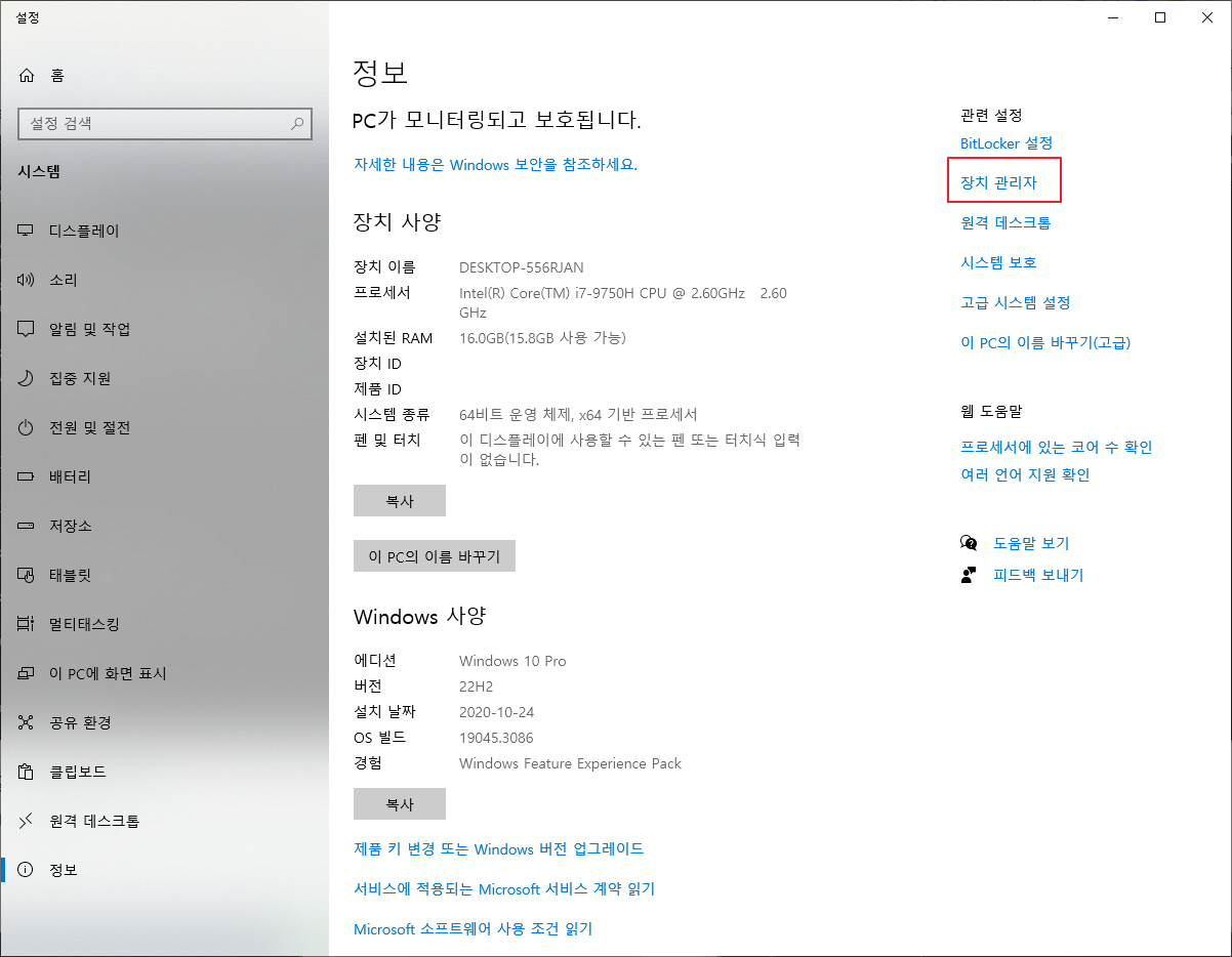 그러면 이런 화면이 나옵니다. 여기서 장치 관리자를 클릭합니다.