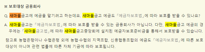 예금자보호법은 금융회사가 파산했을 때 국가차원에서 이자+예금 지급을 보장하는 법이지만 새마을금고는 해당되지 않습니다.