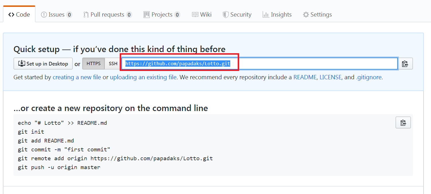 4.생성 이후 넘어가는 화면에서 https://github.com/아이디/프로젝트이름.git 을 복사합니다.