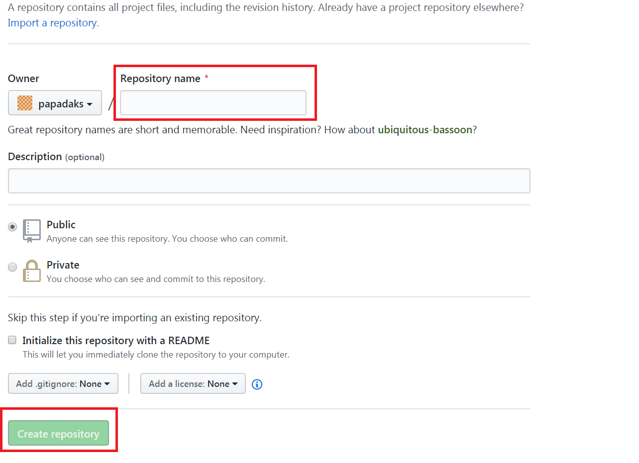 3.Project 이름을 설정합니다. 이후 아래 활성화 된 Create repository를 클릭합니다.