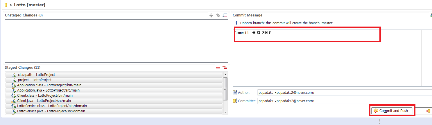 11.Git에 올릴 파일들을 Staged Changed로 옮기고 Commit message를 작성한 다음 Commit & Push를 클릭합니다.