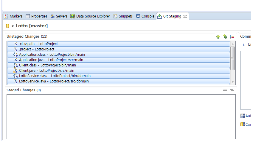 10.하단에 Unstaged Changes에 프로젝트에 있는 소스, 리소스파일들이 있습니다. 전체 선택 후 Staged Changed로 옮깁니다. (드래그 & 드랍 가능)